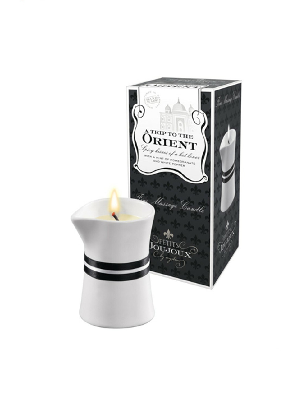 Light up the candle and wait a few minutes to allow a sufficient amount of the pleasant warm massage oil to melt. Blow out the candle and apply the oil on the parts of the skin that you wish to indulge with a sensuous massage. The luxurious Petits Joujoux massage candles are a journey for the senses available in six enchanting scents inspired by six lovely places from all over the world. A trip to the Orient has an extraordinary fragrance of pomegranate and white pepper which is fruity and spicy at once. After the fragrant candle has been lit its wax melts into pleasantly warm massage oil enriched with high quality cosmetic ingredients like jojoba oil and Shea butter that provide the skin with nourishment and care. Petits Joujoux fine massage candles are made from all natural ingredients without any artificial coloring or preservatives. Thanks to their handy poring sprouts and the neat packaging these candles make a perfect gift.