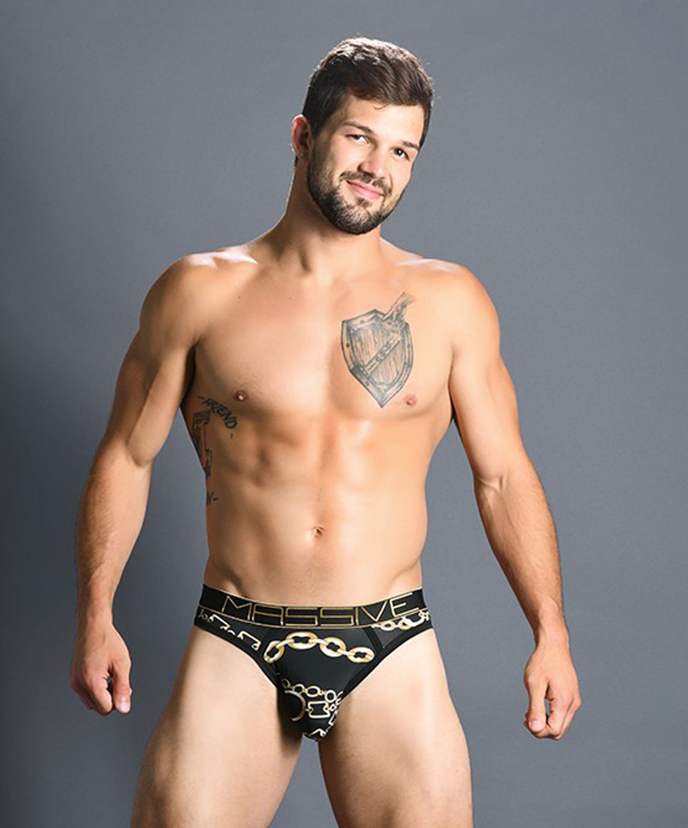 The Massive Chain Frame jockstrap is a stylish jockstrap with a striking design. The jockstrap features a gold-colored chain print and has gold colored lettering on the waistband. The soft fabric envelops your penis and balls and ensures a comfortable fit. There are elastic straps at the back that push the buttocks slightly upwards. The back is also completely open, so that your buttocks remain visible while wearing the jockstrap. The wide, elastic waistband ensures that the jockstrap stays perfectly in place.