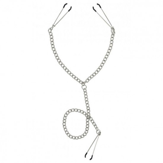 Connect her most sensitive areas together. These clamps have vinyl coated ends, linked chain, and a sliding ring to adjust the tightness anywhere from just enough to hold them on all the way up to a really severe tit torturing pinch. They stay on, they are easy to use, they look good, and they can be heavy or light or anywhere in between.