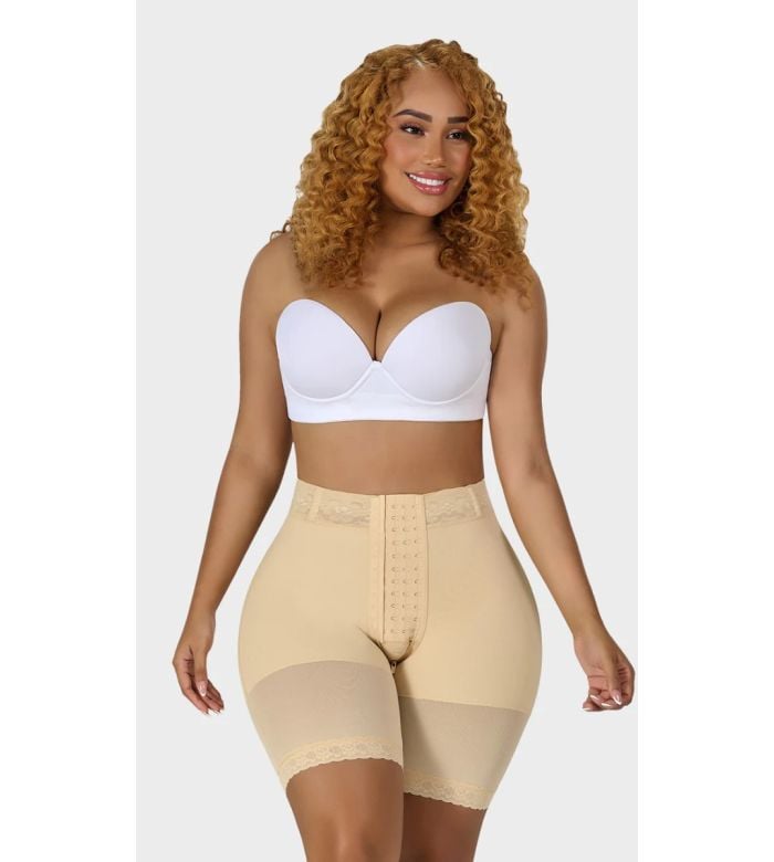 - Description: Our Ref. MYD 0428 Hourglass short with fastening, mid-leg with high waist, medium compression, has a front fastening for a perfect fit, silicone around the contour and internal rods to keep it in place and prevent it from folding or rolling. It has these benefits: