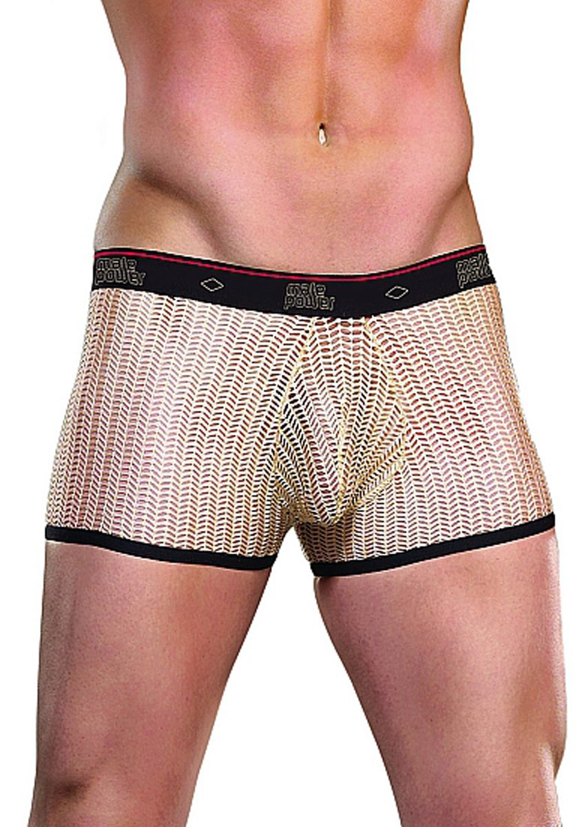 The semi-transparent shorts have a soft elastic waistband, bearing the brand name Male Power.