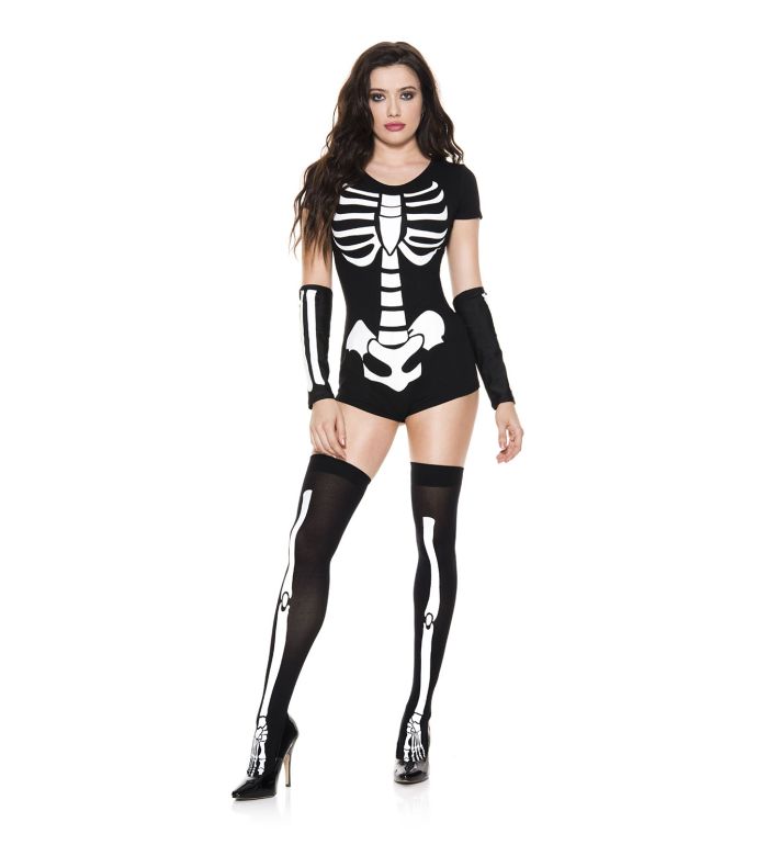 - Description: 3 PC. includes: Skeleton print bodysuit, matching arm warmers, and thigh hi