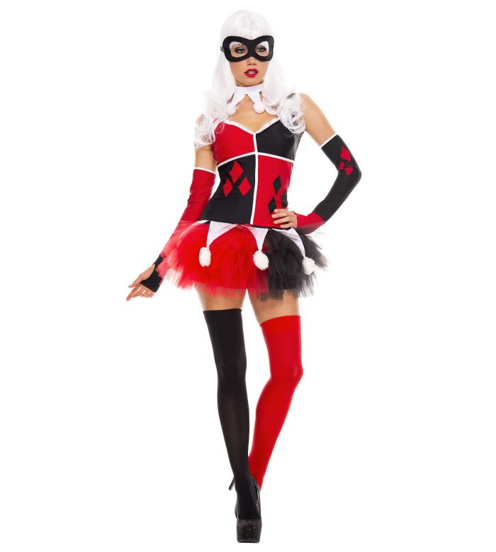 - Description: 5 pc. Jester tutu dress Includes: mask, neck piece, arm warmers and thigh hi