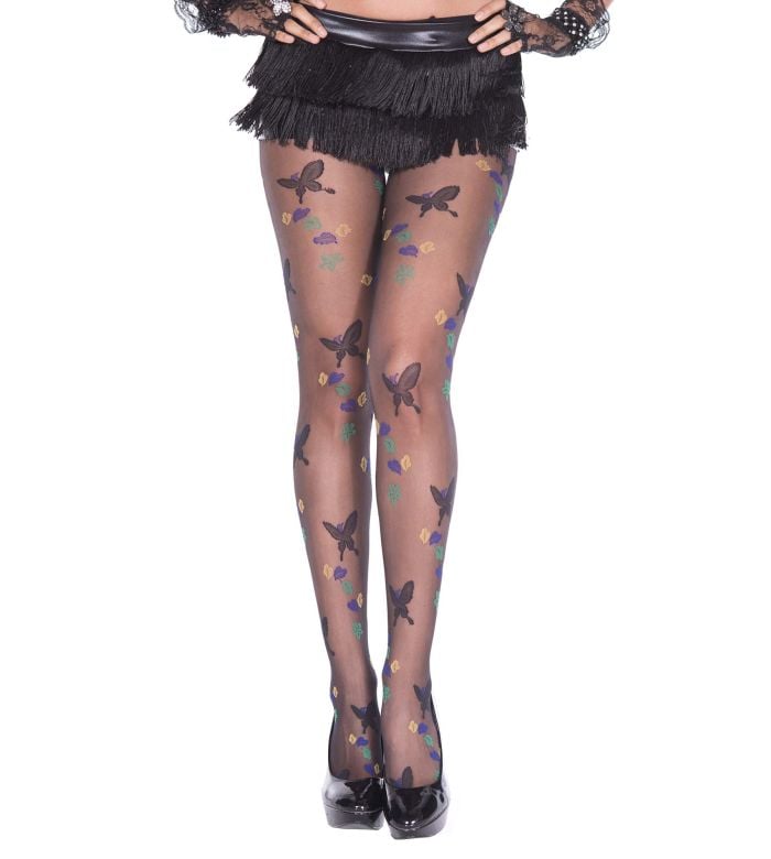 - Description: Fly away in these adorable butterfly pantyhose featuring a scattered pattern of butterflies with yellow, purple and green leaves. (Pantyhose only.)