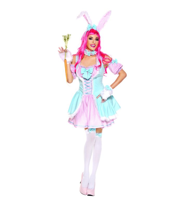 - Description: Exude Springtime in this Rabbit Beauty costume featuring a striped pink and blue dress, lace up bodice, bow accents, furry trim, matching Rabbit ear headband, matching puff sleeves, matching furry gloves with bow accents, and matching thigh high stockings. (Choker, wig, and shoes not included.)
