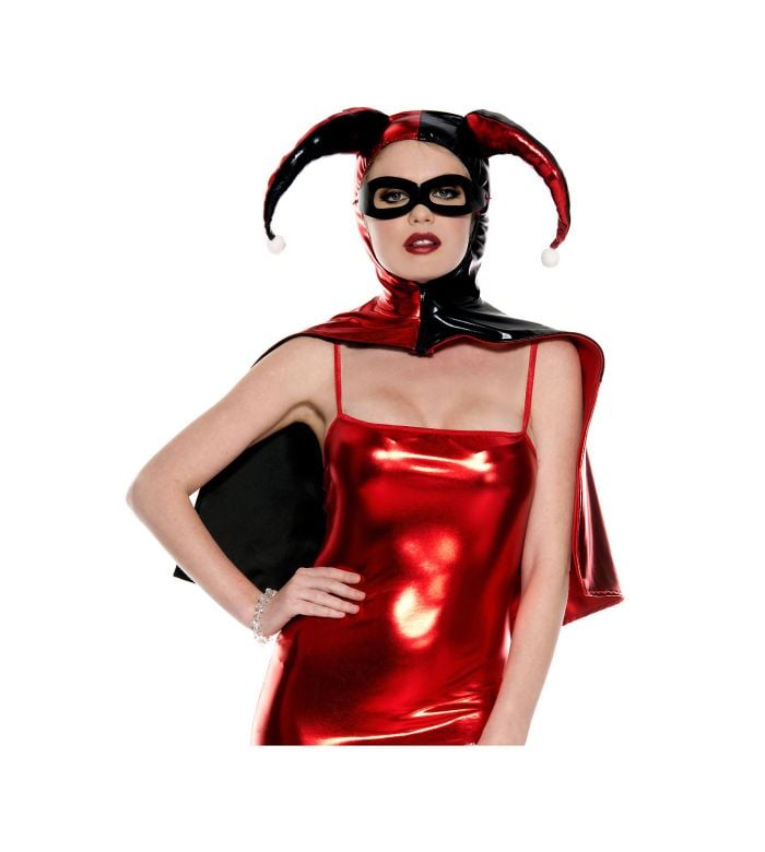 - Description: Complete your sexy jester look with this black and red metallic jester cape with an attached hood and jester crown. (Dress not included.)