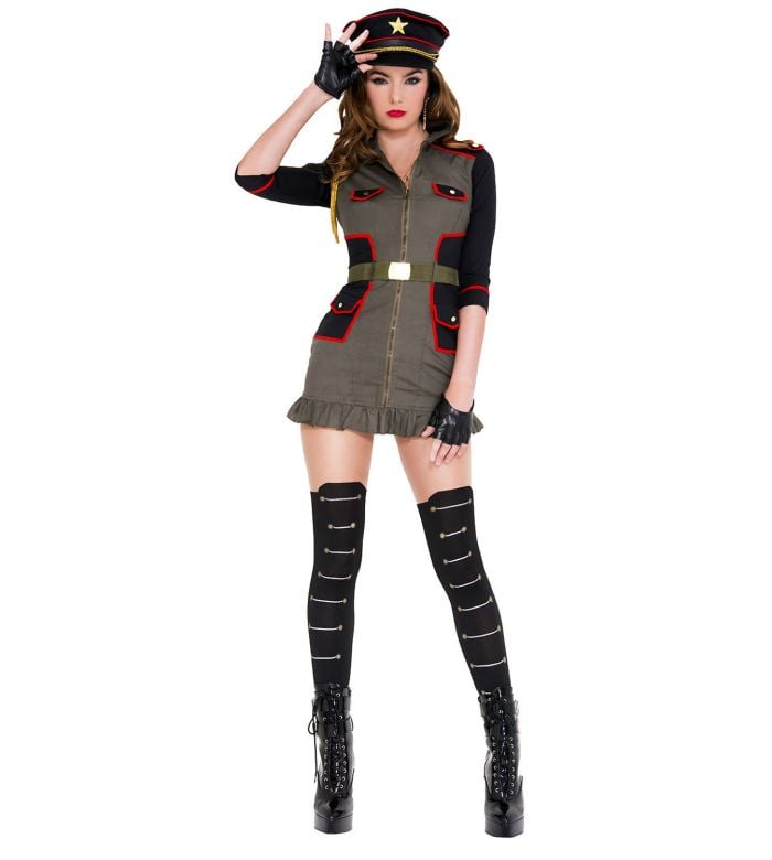 - Description: Keep your soldiers in check with this five-piece Sexy General costume featuring a quarter sleeve mini dress with a zip-up front, ruffle trim, side pockets with red piping detail, green belt, general hat, and pantyhose with gold embellishments. (Gloves not included.)