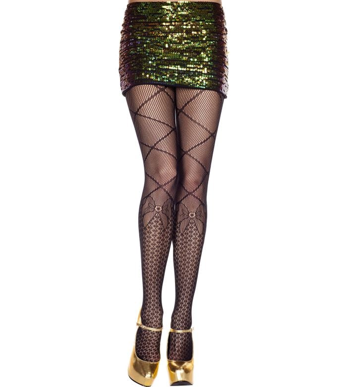 - Description: Micro net faux leg wrap and diamond knee hi with bow print spandex pantyhose
