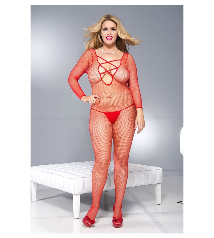 - Description: Plus size criss cross fishnet long sleeve crotchless bodystocking