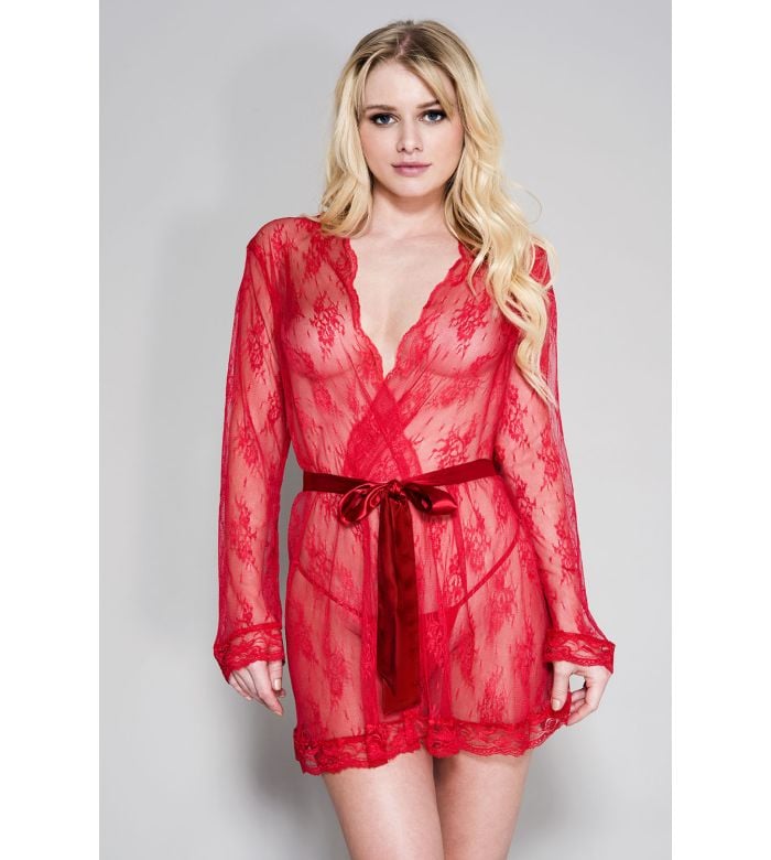 - Description: Sheer lace robe with butterfly sleeves and satin waist tie