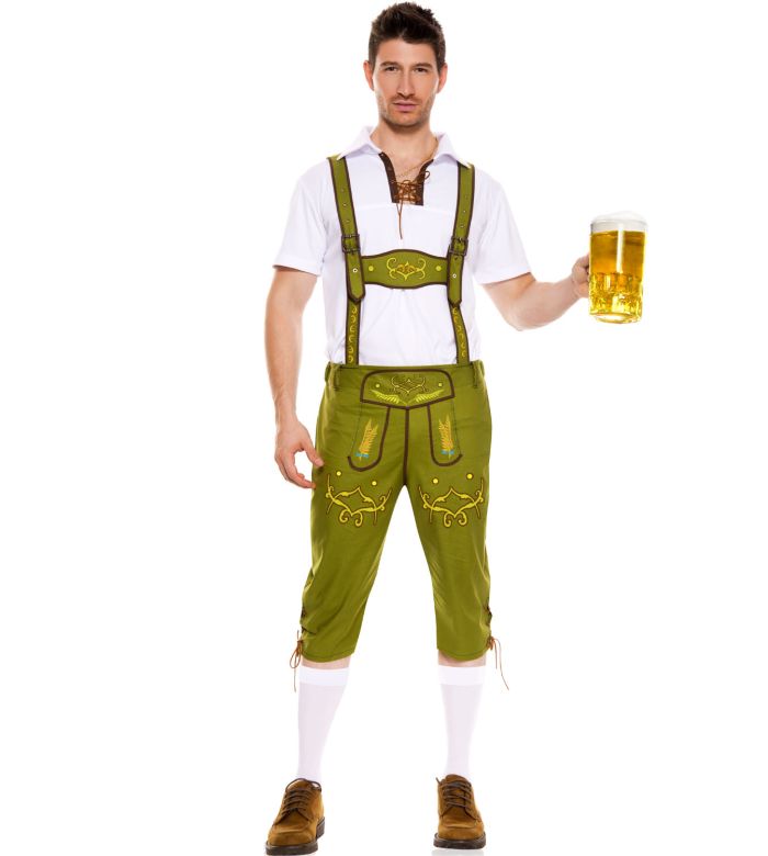 • Description: This two piece Mr. Oktoberfest costume features a lace up collared shirt with adjustable suspenders and Bavarian inspired printed shorts. (Beer glass and knee high socks not included.)