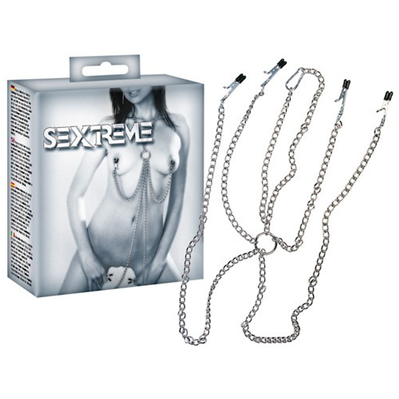 Robust harness made of silvery metal (free of nickel) for her and him. Neck chain, two chains with nipple clamps (total lengths 30 cm each) and two chains with intimate clips (total length 66 cm) are attached to the chest ring (Ø 3.5 cm). Neck chain with carbine is in length adjustable.
