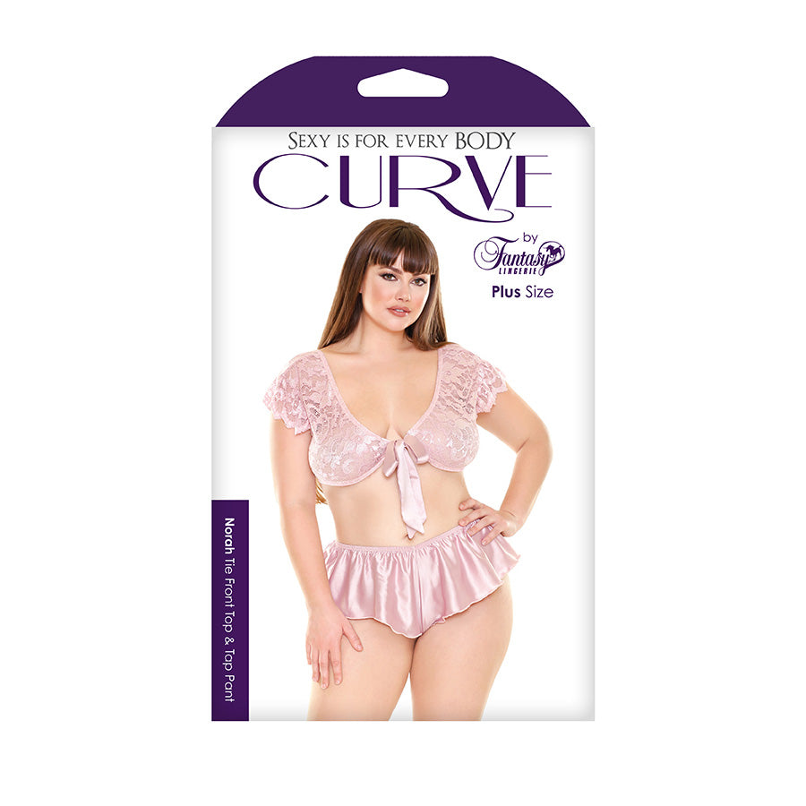 Blush is both the color of this Norah tie front top & tap panty set as well as the kind of reaction it causes. Norah?s cap shoulder tie-front lace top and matching satin flutter tap pant is a simple yet versatile addition to any collection. Feeling gorgeous when you in these Novah Tie Front Top and Tap Pant very nice to wear for fun with lover. It?s made of super soft 95% Polyester 5% Spandex materials that feels light and smooth against the skin. Features Tie top for custom fitMetallic accentsStretch lace fabricFlutter bottom. 1X/2X Sizing Info: Size: 14-18 Bust: 40-46 Hips: 44-49.Available in S/M M/L M/L L/XL 1X/2X 3X/4X Sizes.Hand wash separately in cold water. Do not bleach. Flat dry. Color: Blush Pink.