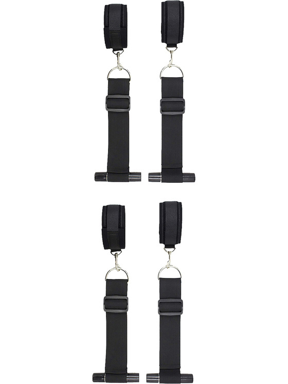The Door Restraint Kit is a set of four straps and shackles that you easily attach to any door to enjoy bondage play. Open the door and place two of the acrylic tubes above the door and the other two below the door before closing (lock for safety). Then imprison your partner to the shackles and experience the thrill. Preferably together with the included blindfold.