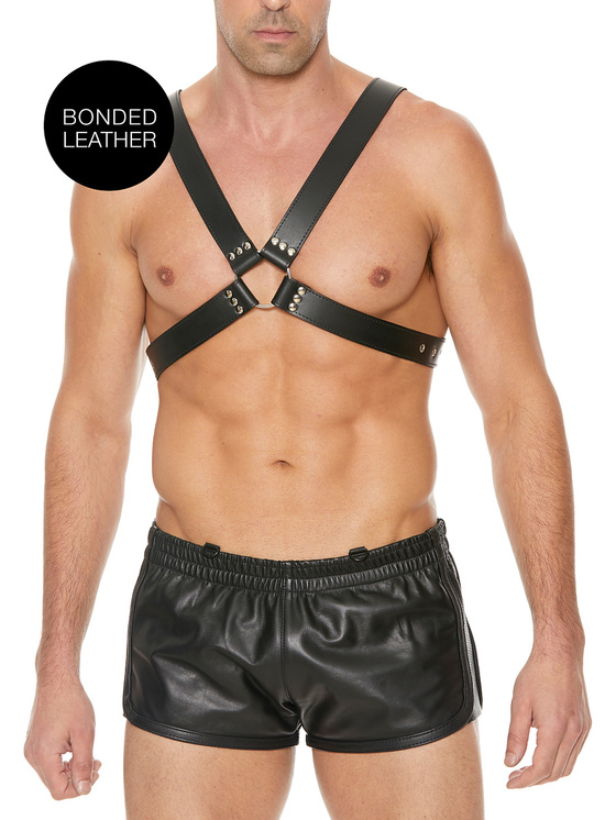 The harness is made of bonded leather with stainless steel-details. With two sturdy O-rings on the front and back, you can attach various BDSM-accessories to take your bondage-play to the next level. You can easily attach leashes, ropes, chains, handcuffs or simply whatever you want.