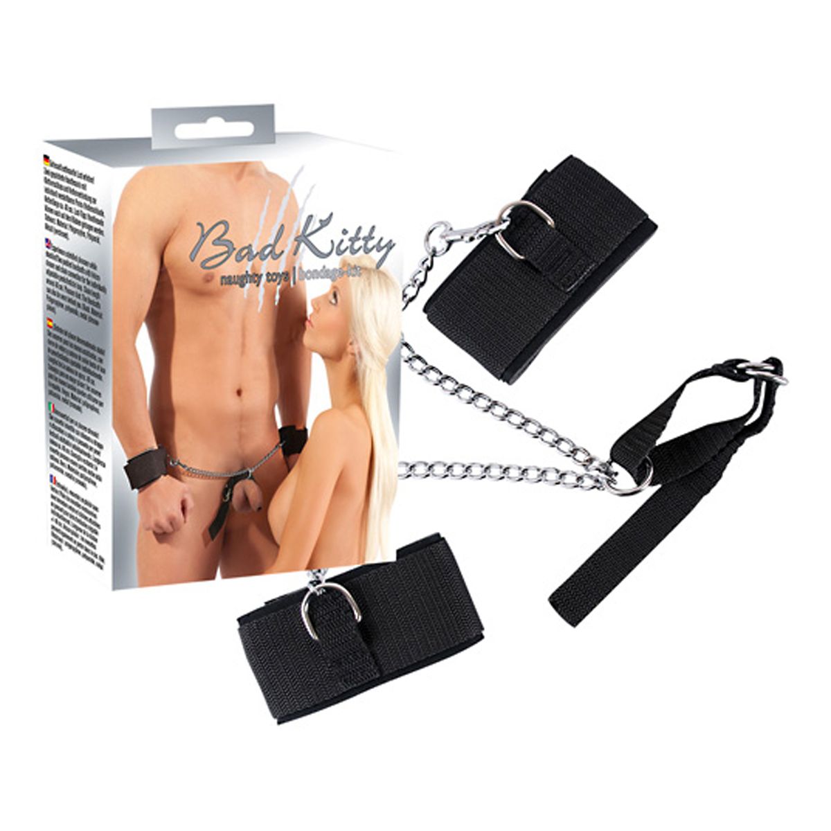 Two padded handcuffs with Velcro fastener and connection chain leading to the adjustable penis/testicle loop. Chain length approx. 48 cm. Black. Material: polypropylene, polyamide, metal (chrome-plated).