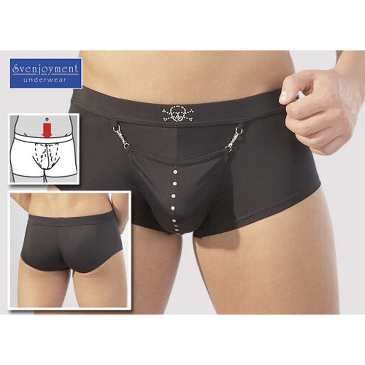 Pitch black boxer briefs with shimmering stud-details. Pouch with front bulging swell effect to be adjusted with snap hook closure in the front. Elastic fabric for a perfect fit