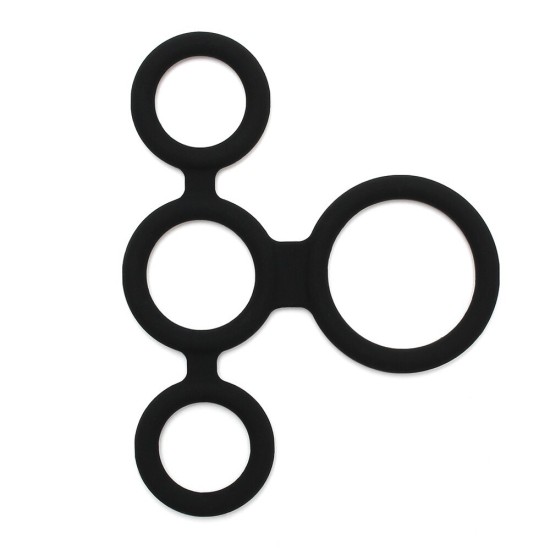 This cockring has four rings that are attached to each other, one with a diameter of 4 cm, one with a diameter of 2.5 cm and two with a diameter of 2 cm. The largest ring 4 cm needs to be worn around the scrotum. The second ring 2.5 cm should be worn around the shaft. The two smaller rings both 2 cm should be placed around one testicle each, splitting the balls.