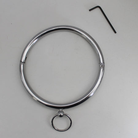 Slim stainless steel collar comes with allen key for a screw tightening. Attached is a stainless steel ring for attaching a leash or lead. Collar measures 15-16″.