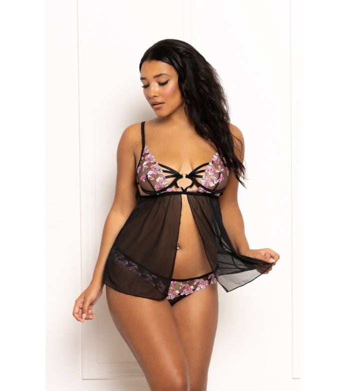 - Two piece babydoll set. Multicolored embroidered floral galloon lace and mesh babydoll with underwire, strappy front detail, gold hardware, flyaway front, and open back panty.