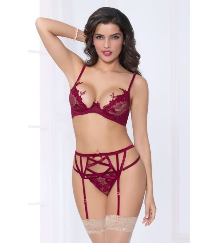 - Description: Three piece bra set. Netting bra with lace appliqué overlay, velvet elastic, adjustable straps, underwire, hook and eye back closure, and gold hardware. Strappy garter belt with back hook and eye closure and thong with front lace appliqué. Thigh High stockings not included.