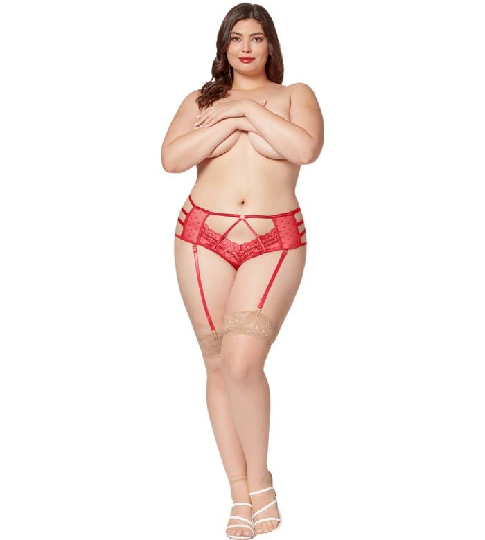 - Description: Dot mesh and scalloped edge lace high rise panty with strappy elastic detailing and adjustable/removable garter straps