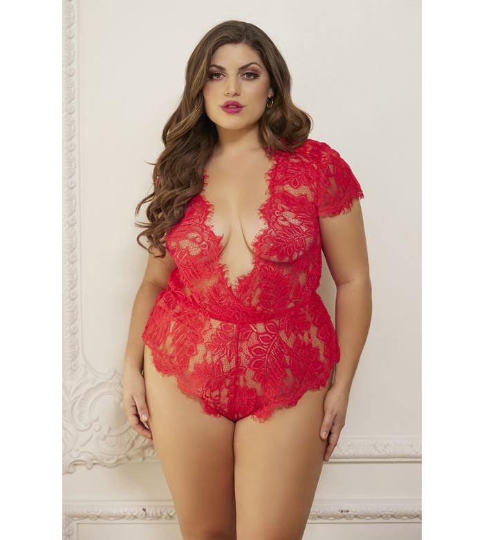 - Description: Eyelash lace romper with plunging neckline, elastic waistband, cap sleeves, ribbon tie back, and snap crotch