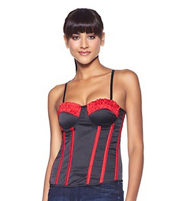 • Description: From world famous celebrity star Jill Zarin – “Real Housewives of New York”. This beautiful Skweez Couture label underwired boned corset is sensational in look and feel. Features include a silky satin fabrication bodice paired with elegant black satin trim for slimming and flattering look. Ruffled red trim on top of cups allows for corset to also be worn as outerwear. Great under a blazer or by itself with a pair of funky jeans! Black hidden zipper back. Adjustable straps are detachable. Padded cups for smooth uplifting look. Ultra high workmanship, details and design make this one of the best corsets we have ever offered at this low price.