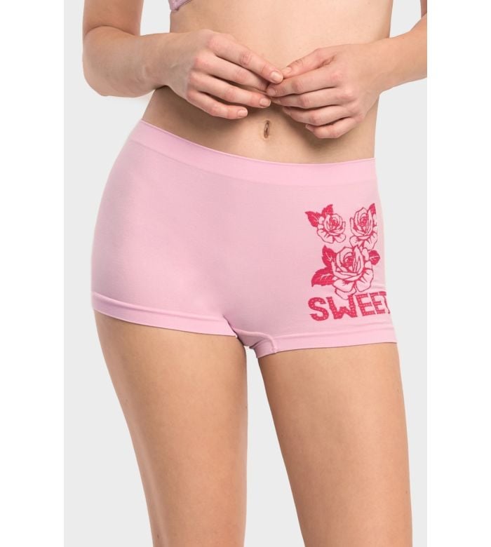 • Description: A contrasting “Sweet” graphic with rose blooms lends a playful and charming vibe to this seamless boyshort that gives you a smooth and sleek shape while staying undetectable under all your outfits. Nylon/spandex. Seamless, trunk-style construction. Mid rise. One size fits most. Available in multiple colors.