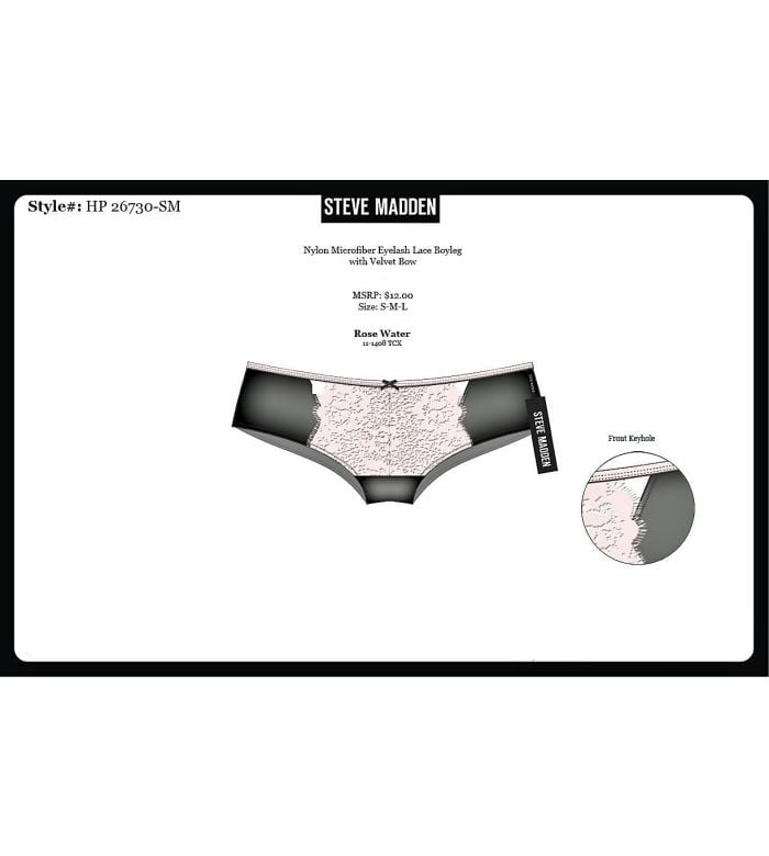 - Description: From top name maker Steve Madden. Beautiful and ultra-high quality microfiber eyelash lace boyleg. Features a sexy little velvet bow. He will find you simply irresistible. Great for any season.