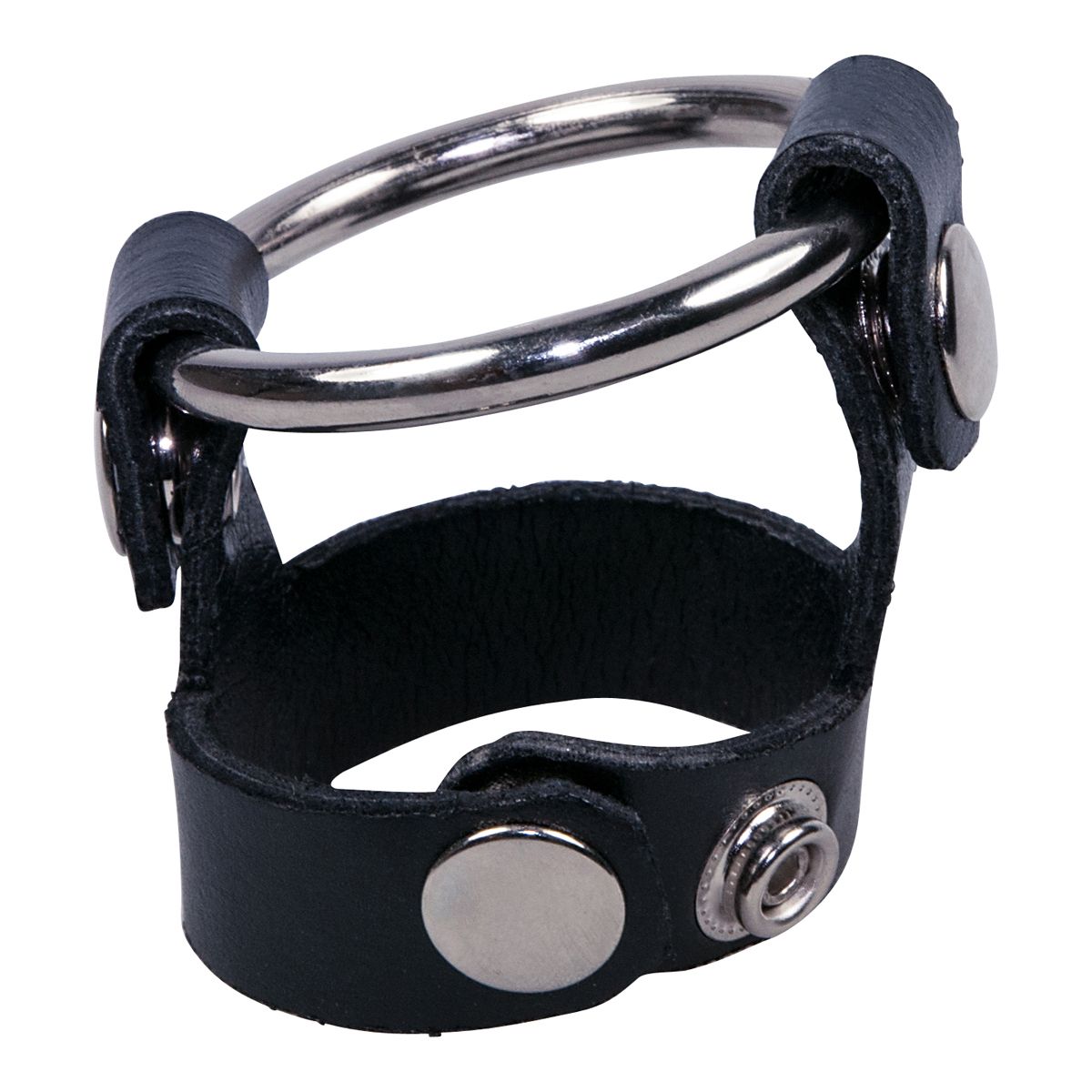 Black leather strap with metal cock ring (ø adjustable from 4.5 to 6 cm) and testicle spreader (ø 4 cm). Material: split leather, metal (chrome-plated).