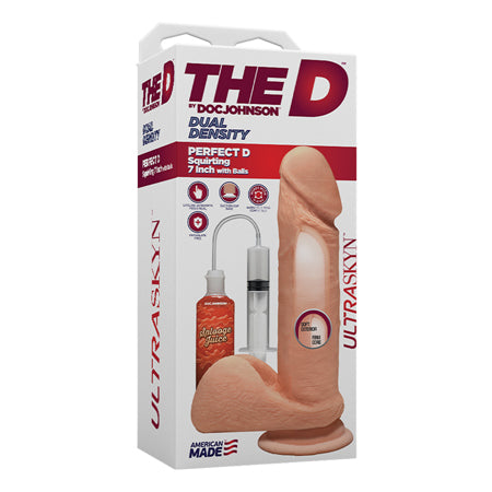 Everybody wants it! Molded from a real erect penis, the lifelike texture and proportions of the dual density ULTRASKYN Perfect D 7-Inch offer the most realistic look and sensation imaginable. The Perfect D is handcrafted to form the ideal balance between the soft, plush exterior and firm inner core that makes this collection so unique, and warms to body temperature with use. A strong suction cup base that affixes to most flat surfaces allows hands-free use, completing the realistic experience. The Squirting D comes with a 1 oz. bottle of Splooge Juice and squirts on command with handheld syringe.