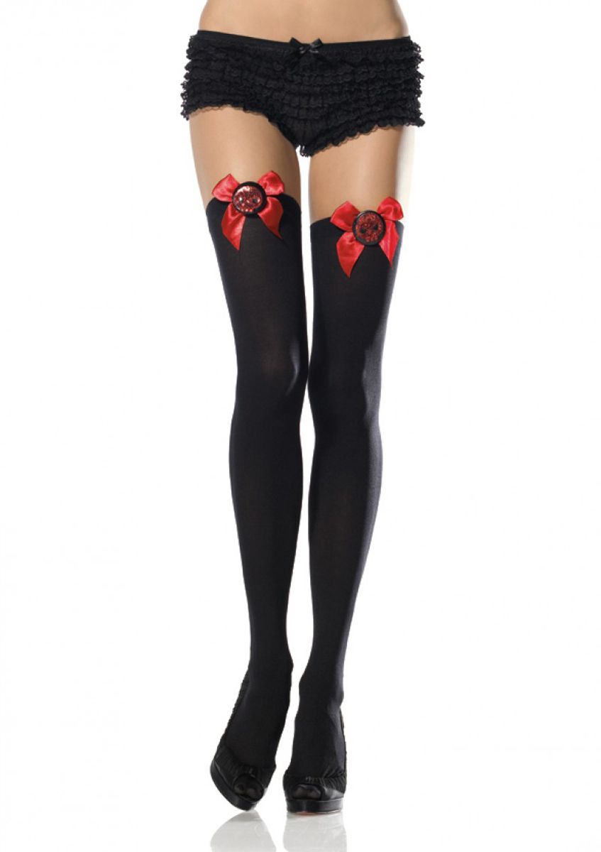 Black opaque stockings with a big red bow topped with a shiny image of a skull.