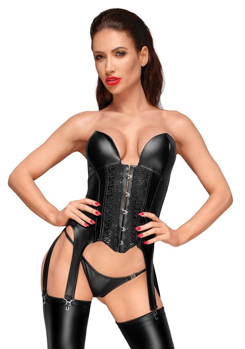 Very stretchy (power) wetlook in a shiny matte black look. Corsage with suspender straps, bones, a hook fastener and embroidery at the front, and lacing down the back. With removable bra straps and 4 removable suspender straps.