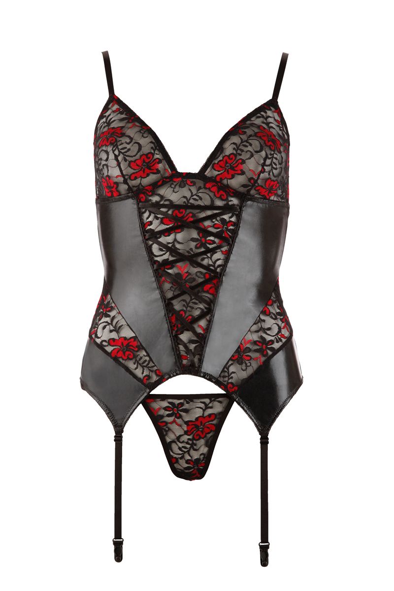 Seduction gets a kinky twist with these sexy suspenders from the Cottelli Collection. This black set is provided with a sensual pink pattern and wetlook details. The shiny pieces ensure an exciting appearance. You will receive a matching g-string of the same material with the top for a complete look. Combine the set with a pair of stockings and you will be ready for an exciting evening in the bedroom!