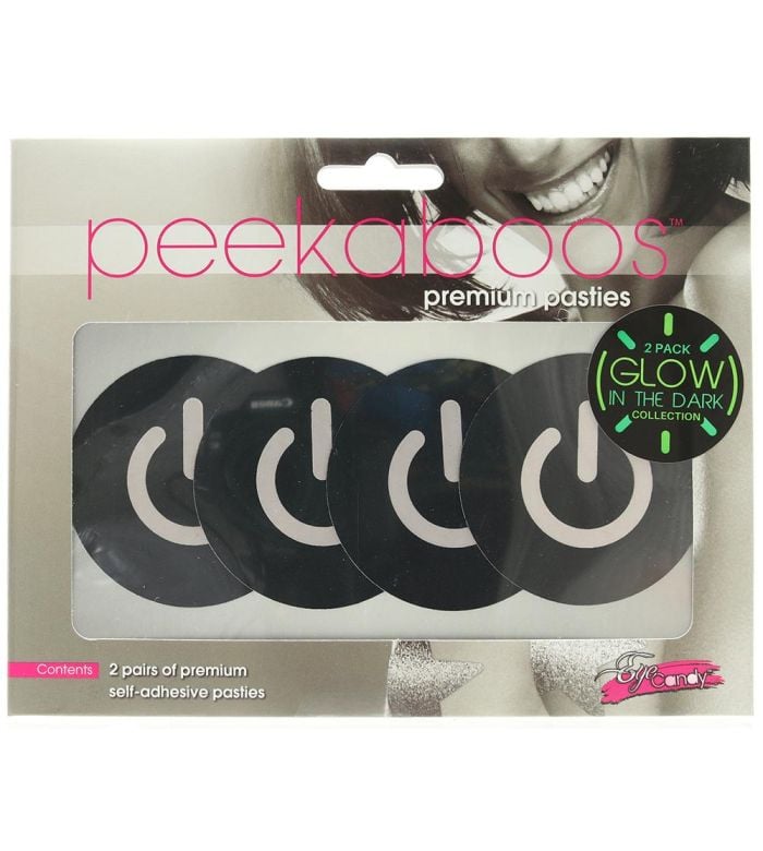 • Description: Light up your life, your night, AND your nipples with Glow in the Dark Power Button Nipple Pasties from the Eye Candy collection. Whether you’re going topless or concealing up the bare minimum under a sheer top, catsuit or favorite deep V t-shirt, these four packs have you covered – just enough.